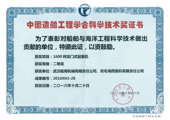 近日,中國造船工程學(xué)會傳來喜訊,我司《1600噸龍門式起重機》榮獲科學(xué)技術(shù)二等獎。這是青島海西重機在船舶與海洋工程領(lǐng)域獲得的又一項具有較高影響力的榮譽。