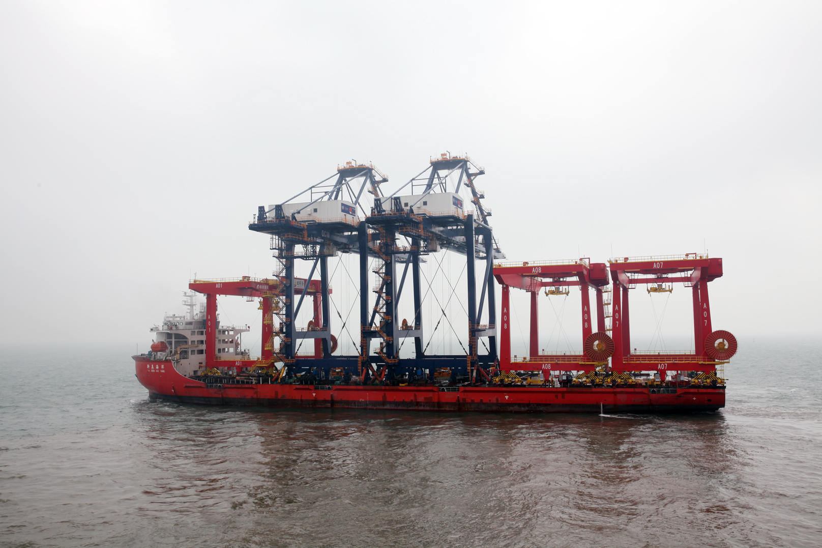 11月5日10時58分,碼頭現(xiàn)場鞭炮齊鳴,汽笛長鳴,伴隨著運輸船主機運轉(zhuǎn)的轟鳴聲,裝載海西重機為寧波舟山港乍浦港區(qū)承制的2臺50t-38m岸邊集裝箱起重機(簡稱G216項目)和為日照港集裝箱發(fā)展有限公司承制的第二批3臺自動化軌道式集裝箱龍門起重機(簡稱G219項目)的運輸船緩緩駛離公司碼頭,標志G219項目第二批設備和G216項目順利發(fā)運。