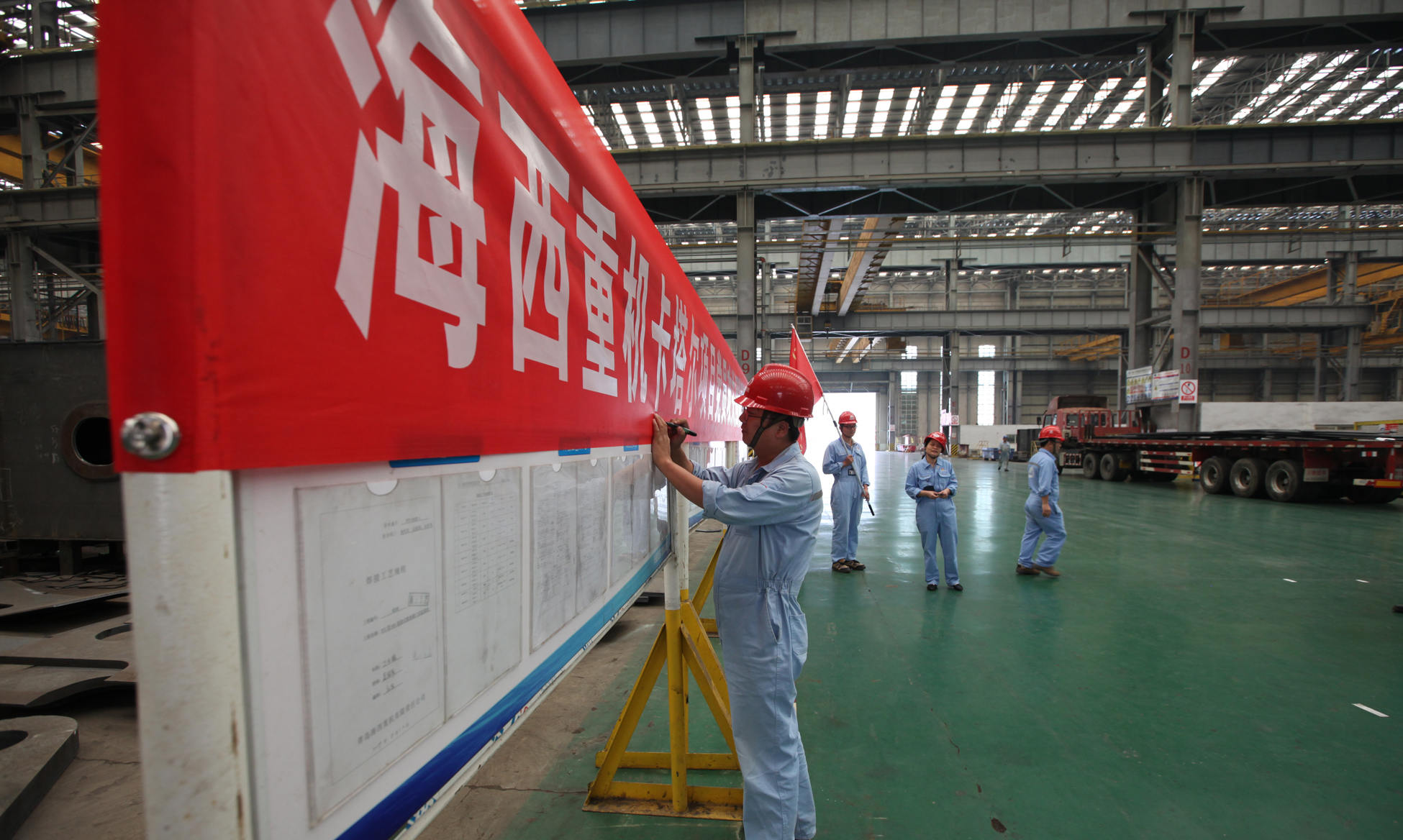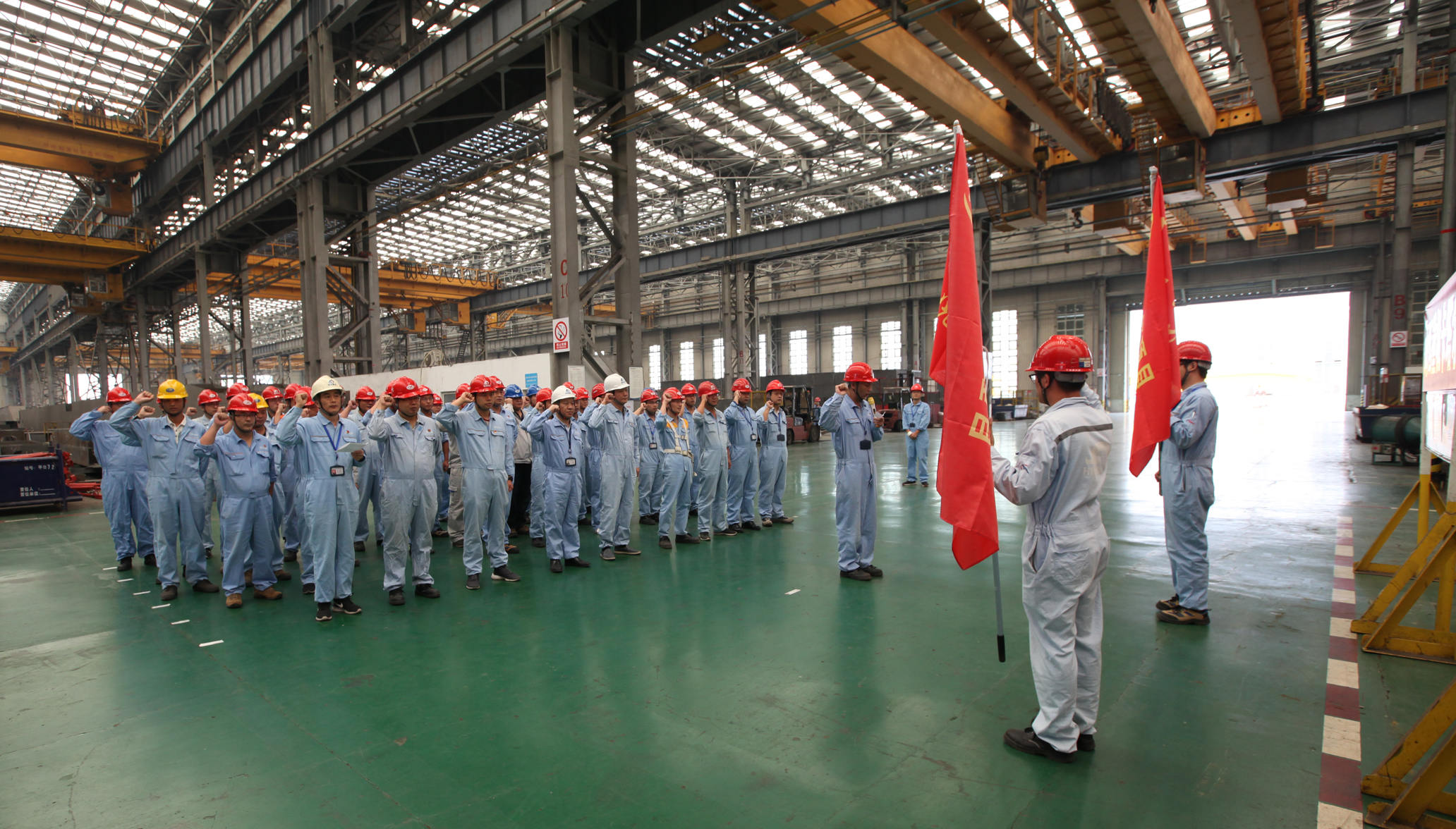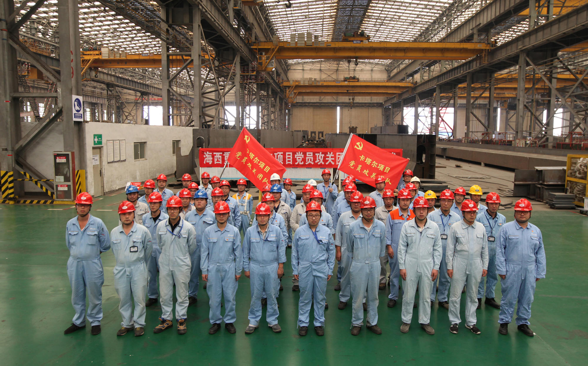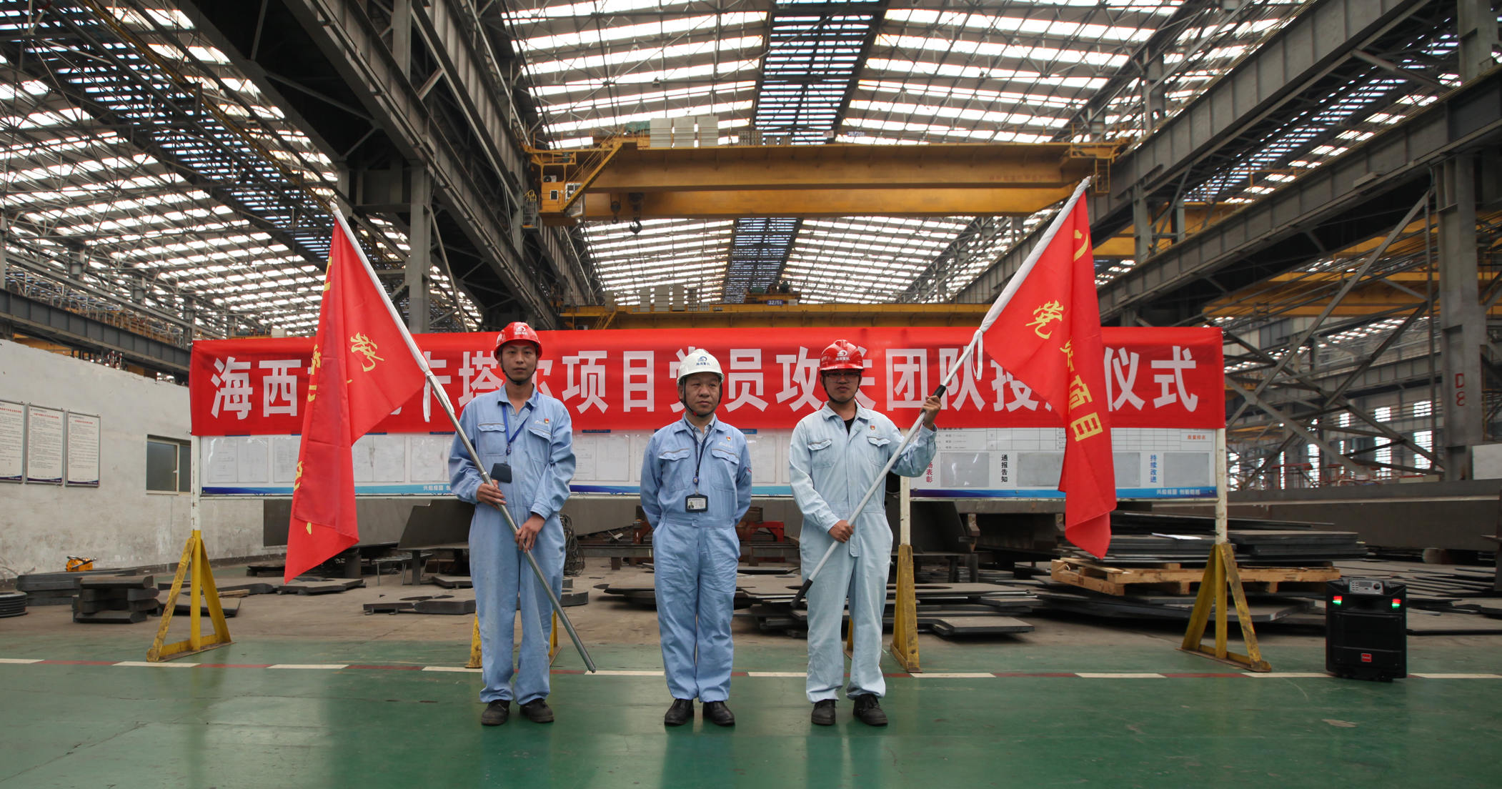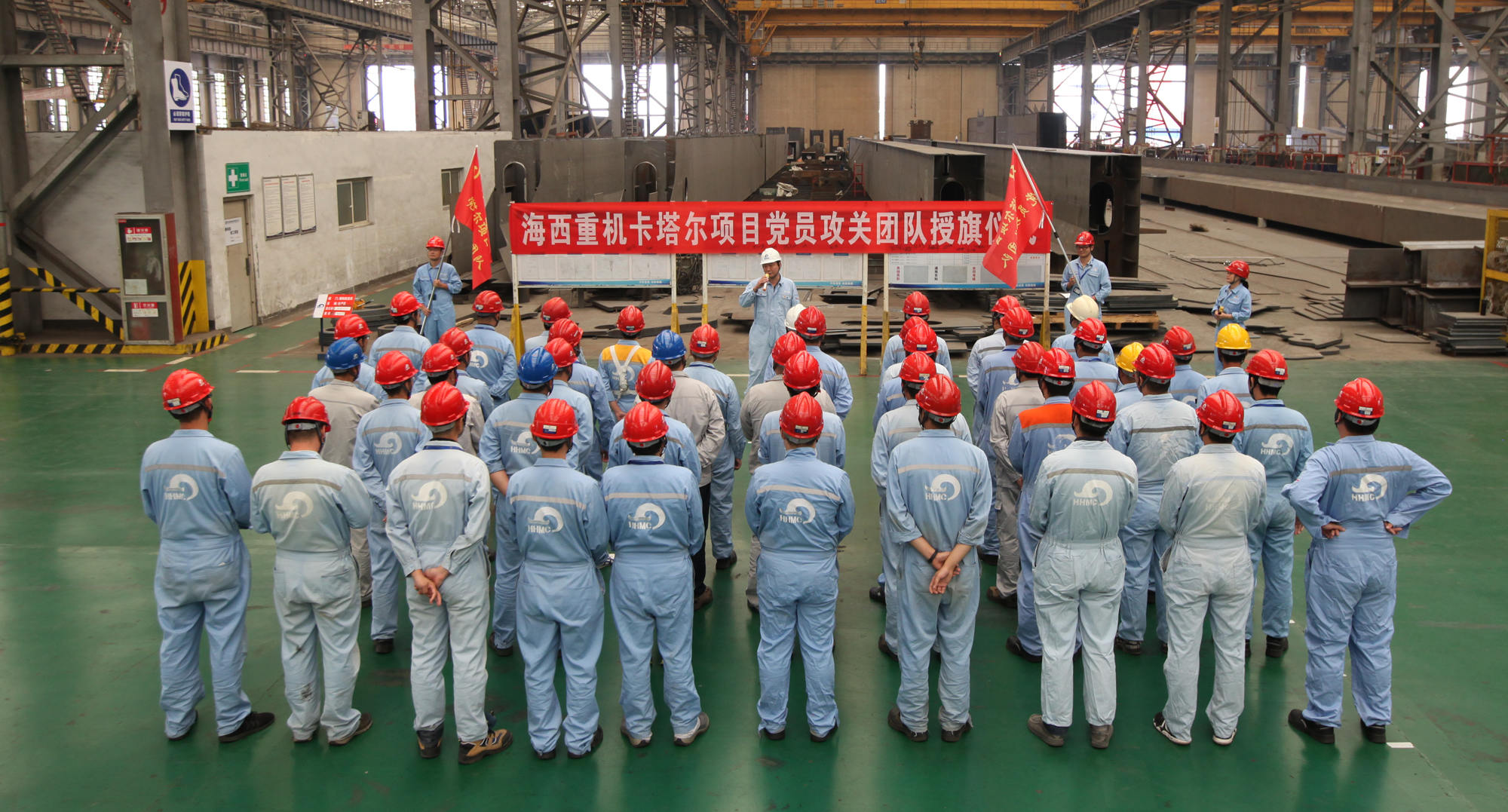 9月20日上午,卡塔爾項目黨員攻關(guān)團隊授旗儀式在海西重機新鋼結(jié)構(gòu)廠房順利舉行。海西重機黨委書記、董事長鄧振山,黨委副書記、總經(jīng)理張懷志,黨委副書記、紀委書記朱聲凱,黨員骨干以及施工單位負責人等50余人參加本次授旗儀式。