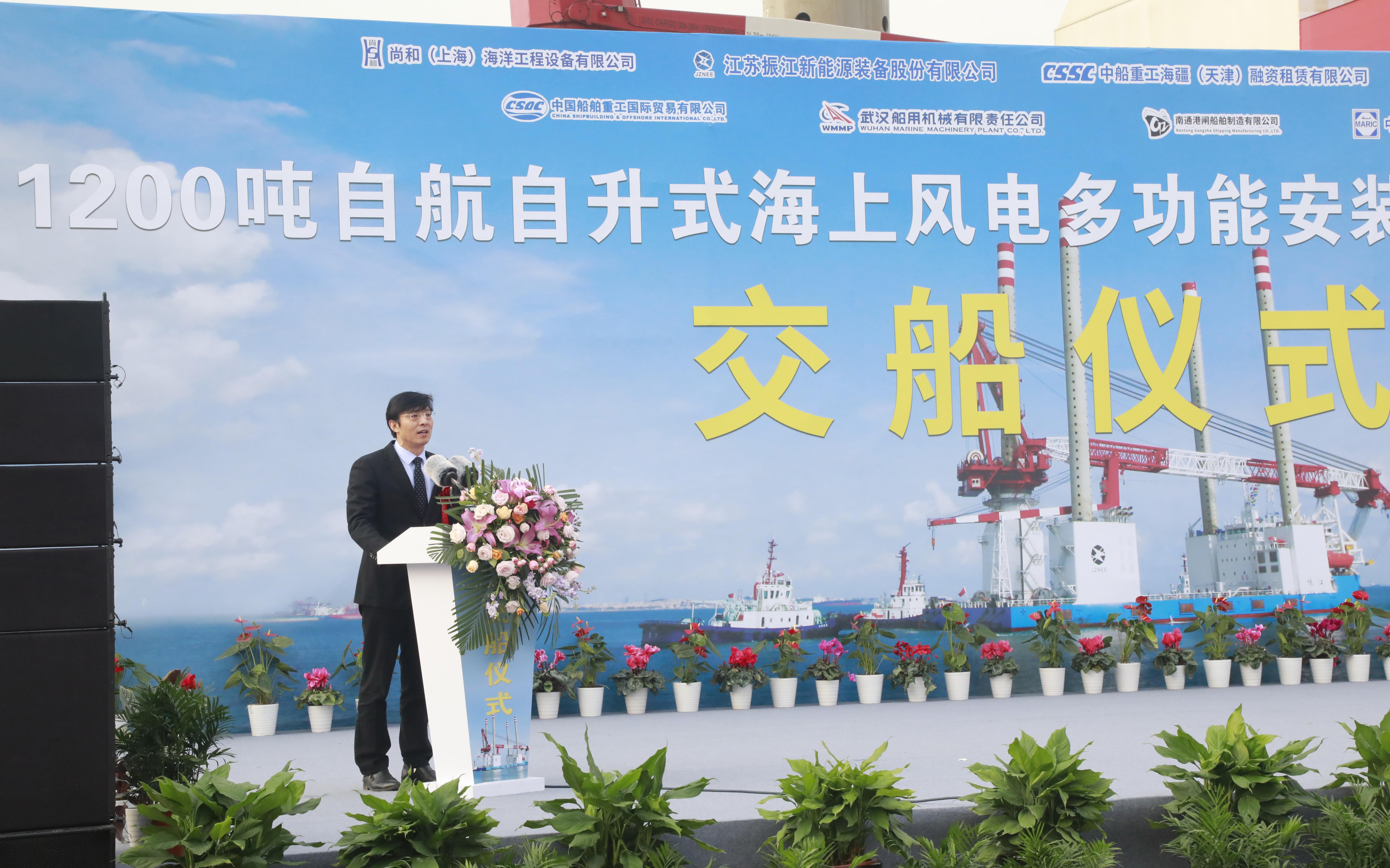 武漢船機黨委書記、董事長馬聚勇代表公司在平臺交付儀式上致辭,對參加交船儀式的各位領(lǐng)導、同仁以及為該平臺生產(chǎn)制造和試驗成功付出辛勤勞動的所有監(jiān)造人員和工作人員表示由衷感謝。馬聚勇同志指出,“振江”號風電安裝平臺是武漢船機連續(xù)交付多艘自升式輔助平臺后,再次作為總包方承擔的全部項目建造任務。項目合同簽訂后,公司上下高度重視,充分發(fā)揮設(shè)備集成和平臺總包能力,集中武漢本部和青島海西兩地優(yōu)勢資源,不斷加強生產(chǎn)組織管理,從源頭上保證了建造質(zhì)量和周期,較好地滿足了平臺建造進展。自平臺開工建造到今天正式交船,中國船級社始終給予悉心指導,各參建方發(fā)揮自身優(yōu)勢,通力合作,突破多項技術(shù)難關(guān),為平臺順利交付和使用提供了強有力保障
