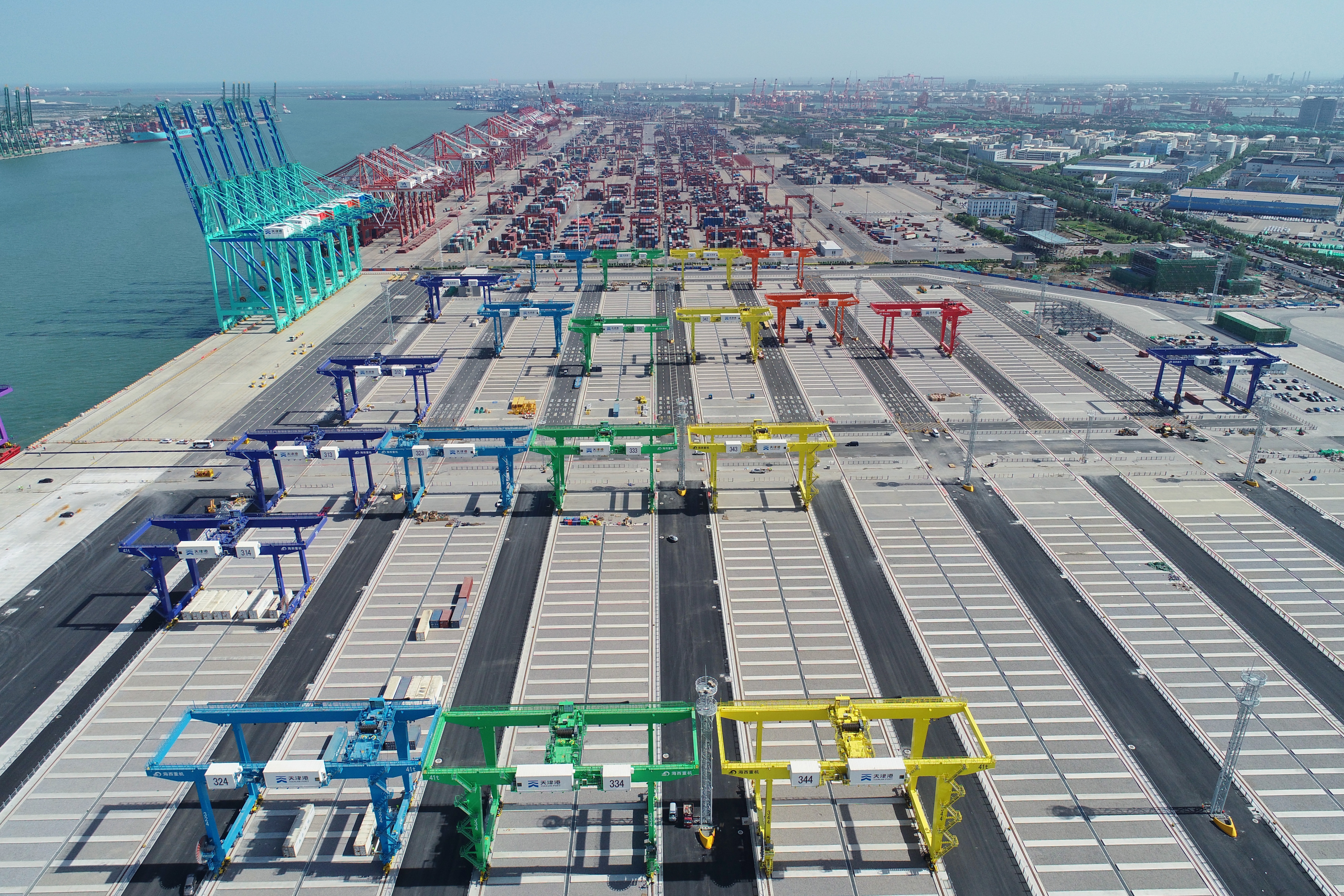 2020年,海西重機為該碼頭一期工程打造了25臺41t-34m自動化軌道吊,分別采用紅、橙、黃、綠、深藍、淺藍、紫7種顏色“繪制”,光彩奪目。每臺軌道吊配置了先進的自動化控制系統,能夠實現堆場整體輪廓實時掃描、機構全自動精細化定位及吊具最優(yōu)路徑規(guī)劃,同時配備多重安全防撞保護和智能態(tài)勢檢測系統、智能遠程潤滑系統、智能車號識別等智能輔助系統,使用起來安全、綠色、高效,是目前最先進的自動化軌道吊,可謂是顏值與實力并存,設備投產后取得了良好的成效。此次二期工程項目由17臺自動化軌道吊組成,于2020年年底開工,采用同樣的顏色、同樣的工藝制造,與一期設備會合后,整齊劃一的自動化軌道吊成為天津港碼頭一道靚麗的“彩虹”。