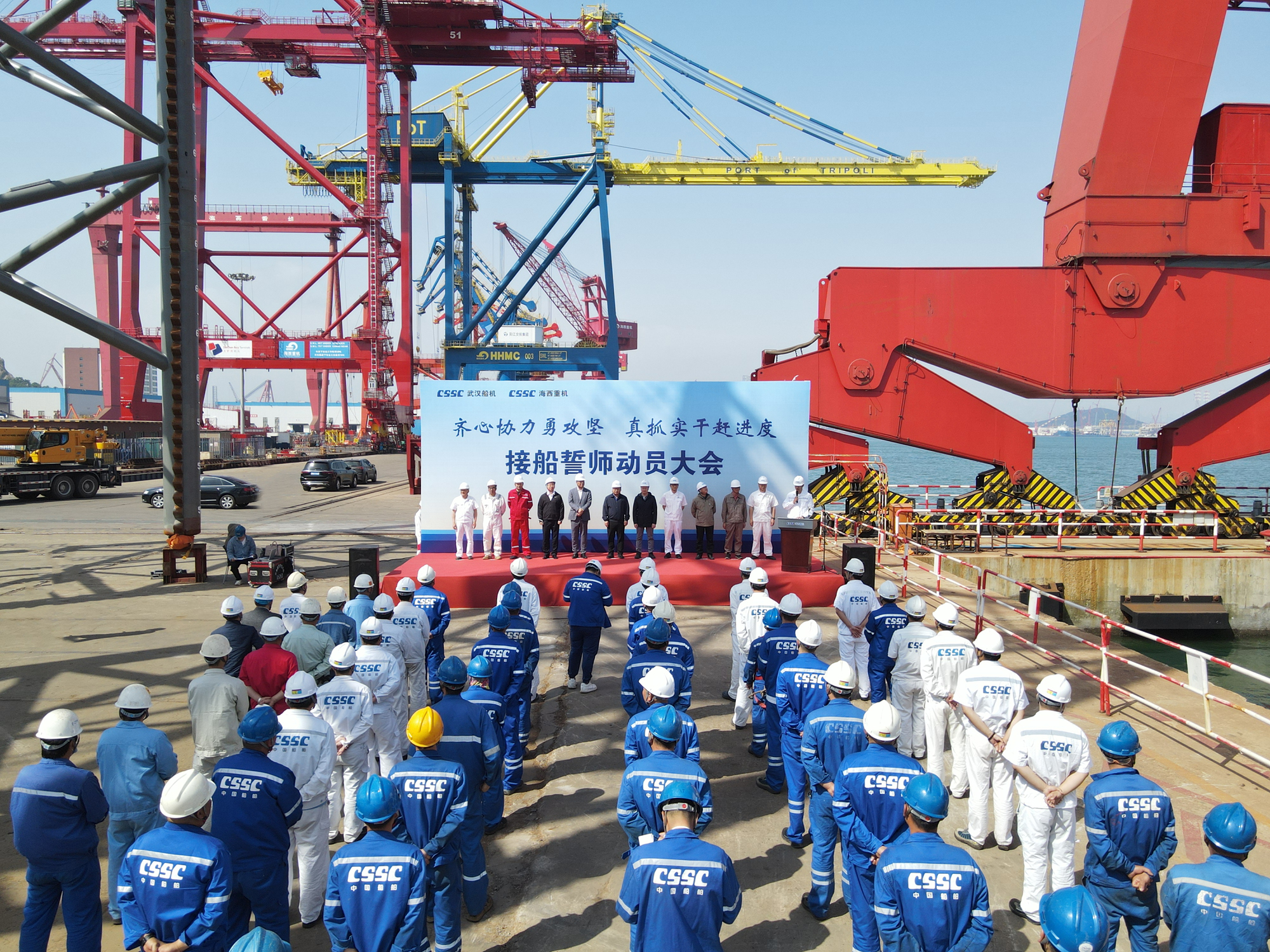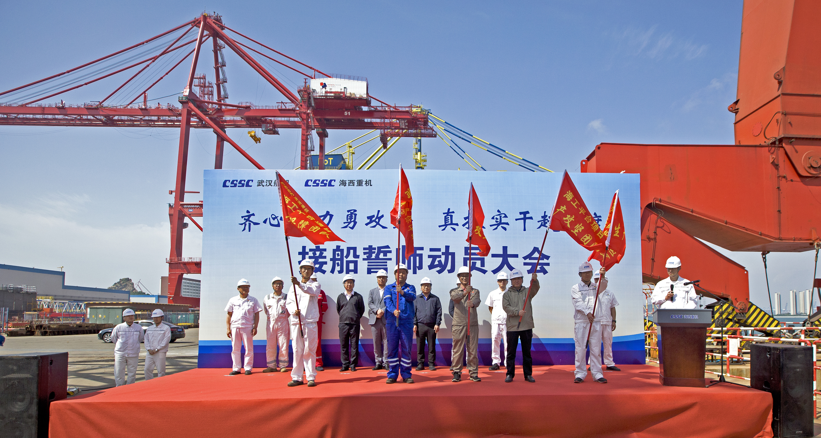 為了明確目標(biāo)、凝聚共識、齊心協(xié)力、克難攻堅,亮明迎難而上的堅定信心和堅強(qiáng)決心,動員全員上下持續(xù)營造濃厚干事氛圍,掀起“齊心協(xié)力勇攻堅,真抓實(shí)干趕進(jìn)度”的高潮,全力以赴打好海工項目集中攻堅戰(zhàn),5月25日上午,中國船舶集團(tuán)旗下武漢船機(jī)海西重機(jī)公司在生產(chǎn)現(xiàn)場組織開展接船誓師動員大會。華夏金融租賃有限公司、北京神大集團(tuán)有限公司、飛勵特船舶管理有限公司、大津重工泰州分公司、江陰雙馬重工裝備有限公司、武漢船機(jī)海西重機(jī)等相關(guān)方參加本次動員大會。