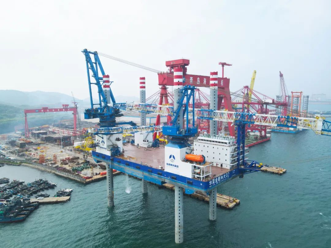 華夏金租神大02號1200噸風電安裝平臺于2022年8月21日開工建造,2023年6月30日到達青島,2023年8月21日完成試航。到達青島海西后,項目組成員在01號平臺成功交付的基礎上,采取扎實有效的措施,狠抓生產(chǎn)組織與過程控制,僅用了不到3個月的時間就完成主輔吊機安裝、樁腿接樁、系泊試驗、試航等主要工作,提前合同交貨期交船,向用戶交上了一份滿意的答卷。