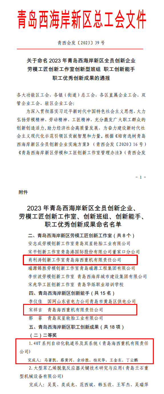 此次評選工作由青島西海岸新區(qū)總工會組織開展,經(jīng)過海西重機(jī)基層工會推薦,資料申報、西海岸新區(qū)總工會資格審查、專家組評審,區(qū)總工會現(xiàn)場考察、會議研究及社會公示等環(huán)節(jié),最終“肖利濤創(chuàng)新工作室”榮獲西海岸新區(qū)“勞模工匠創(chuàng)新工作室”榮譽(yù)稱號,位居同類第三;“40T系列自動化軌道吊及其系統(tǒng)(完成人:馬著凱、蔡黃河、余珍勝、楊雙華、王金東、丁云鵬)”榮獲西海岸新區(qū)“職工創(chuàng)新成果”二等獎;宋祥吉同志脫穎而出,榮獲西海岸新區(qū)“職工創(chuàng)新能手”榮譽(yù)稱號。