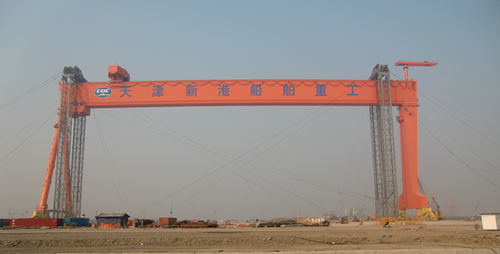 青島海西重機有限責任公司總承制的天津新港船舶重工有限責任公司臨港造修船基地首臺600噸×207米龍門吊,9月23日上午開始預(yù)提升,9月26日下午13點36分開始正式提升,于10月7日下午16點53分順利安裝到位,創(chuàng)下了國內(nèi)同類型龍門吊提升時間最短紀錄。