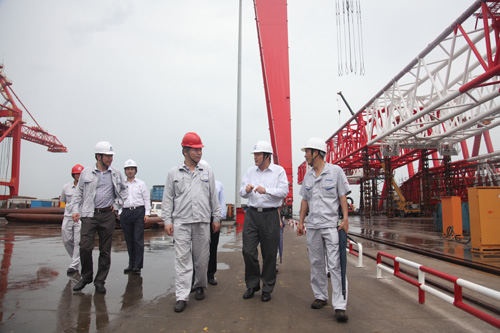 在參觀公司現(xiàn)場建成自用的1600噸龍門吊項目、正在吊裝上船的3600噸全回轉(zhuǎn)浮吊項目、面對公司的120米突堤碼頭以及繁忙的生產(chǎn)組裝現(xiàn)場,董總對公司的經(jīng)營發(fā)展態(tài)勢予以充分肯定。他說:在當(dāng)前市場經(jīng)濟(jì)低迷的形勢下,青島海西重機能夠抓住發(fā)展機遇,逆勢而上,尤其在技術(shù)創(chuàng)新和產(chǎn)品開發(fā)方面發(fā)揮了自身潛能,具有前瞻性和市場眼光,更是武漢船機公司在船市低迷的情況下,產(chǎn)品結(jié)構(gòu)調(diào)整的有力體現(xiàn)。董總特別對近期在煙臺、連云港、海南洋浦等港口項目投標(biāo)中,我司與上海振華同臺競標(biāo)并連續(xù)奪得標(biāo)的給予了高度肯定。