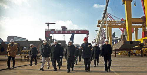 許克振一行實(shí)地考察了海西重機(jī)生產(chǎn)現(xiàn)場(chǎng)及組裝發(fā)運(yùn)現(xiàn)場(chǎng),參觀了包括韓國(guó)批量岸橋、自動(dòng)化軌道吊等在內(nèi)的港口機(jī)械設(shè)備及在制的批量自升式海工平臺(tái)項(xiàng)目,看望慰問(wèn)了生產(chǎn)一線(xiàn)干部職工,并在隨后召開(kāi)的中船重工青島海西灣基地相關(guān)企業(yè)負(fù)責(zé)人座談會(huì)上,聽(tīng)取了海西重機(jī)董事長(zhǎng)孫總關(guān)于企業(yè)產(chǎn)品結(jié)構(gòu)、技術(shù)創(chuàng)新、生產(chǎn)經(jīng)營(yíng)及中長(zhǎng)期發(fā)展規(guī)劃等方面的情況匯報(bào)。